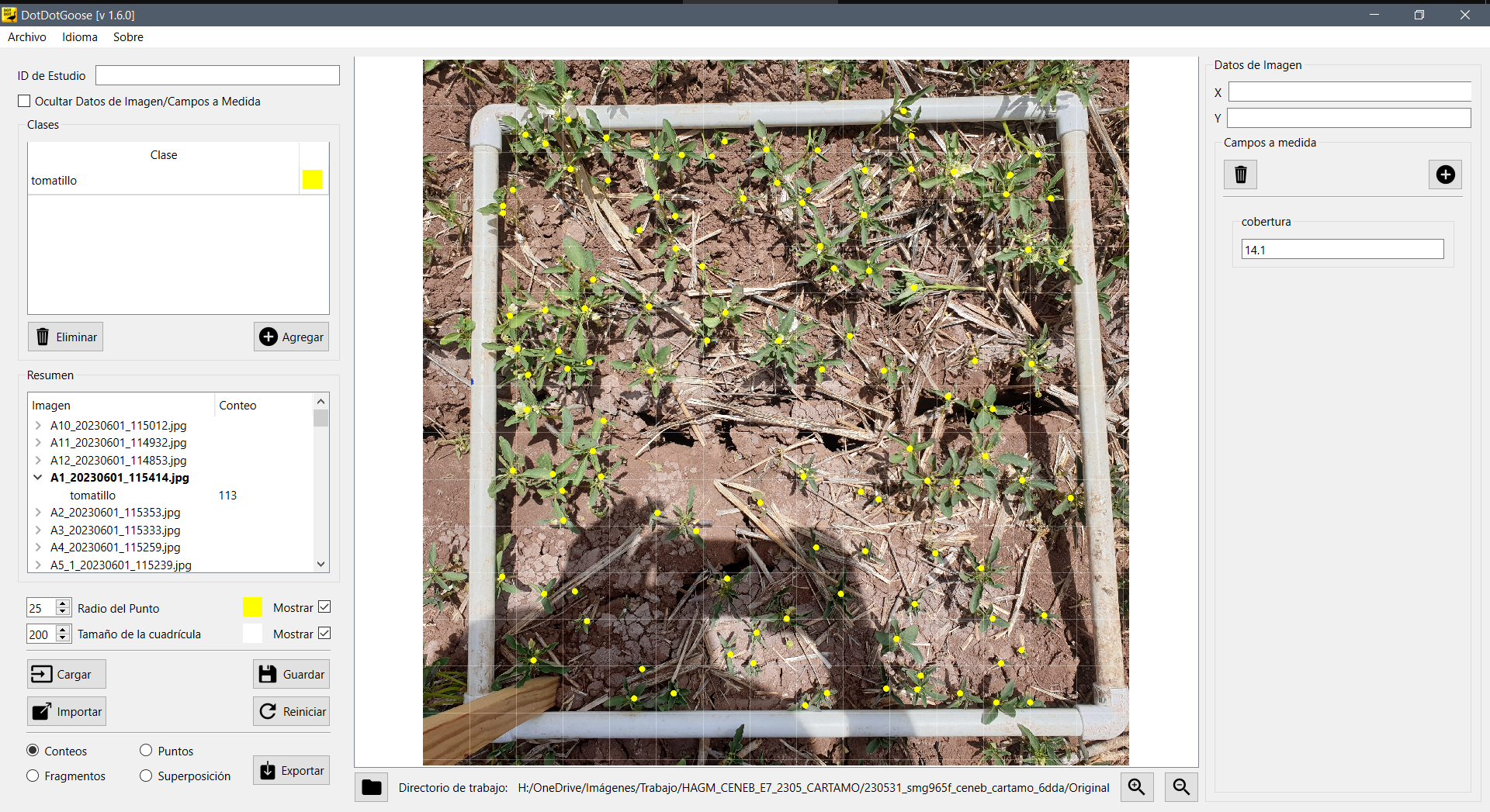 Se tomaron fotografías de las parcelas en cada una de las evaluaciones. Dichas fotografías fueron utilizadas para contar el número de plantas por medio de métodos informáticos utilizando la aplicación DotDotGoose version 1.6.0 (Ersts, P.J. [Internet]). Figura 2
