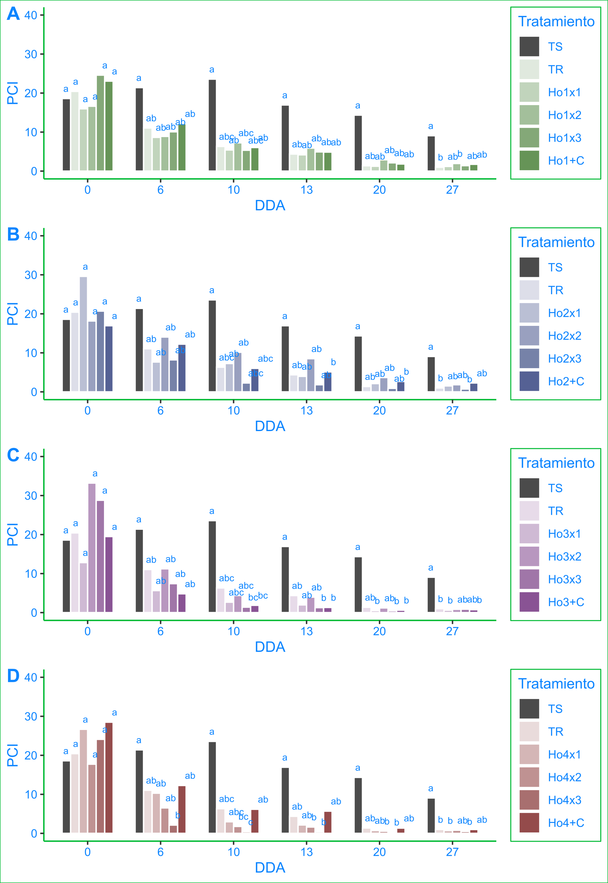 Los datos son el promedio ± el error estándar de 4 repeticiones. Diferentes letras en la misma columna indica diferencias significativas (p < 0.05) entre tratamientos de acuerdo a la prueba de Tukey. DDA: Días después de la aplicación. IT: Identificador de tratamiento. GH: Grupos homogéneos.